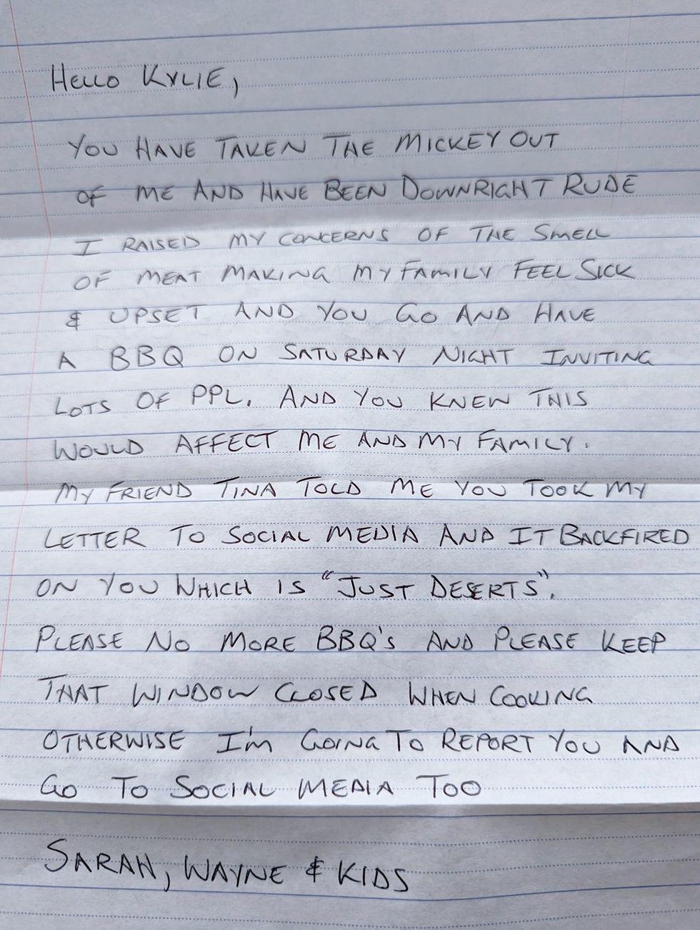 The note added: "Please no more BBQ's and please keep that window closed when cooking otherwise I'm going to report you and go to social media too."