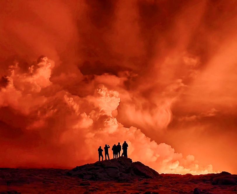 A local resident watch smoke billow as the lava colour the night sky orange from an volcanic eruption on the Reykjanes peninsula