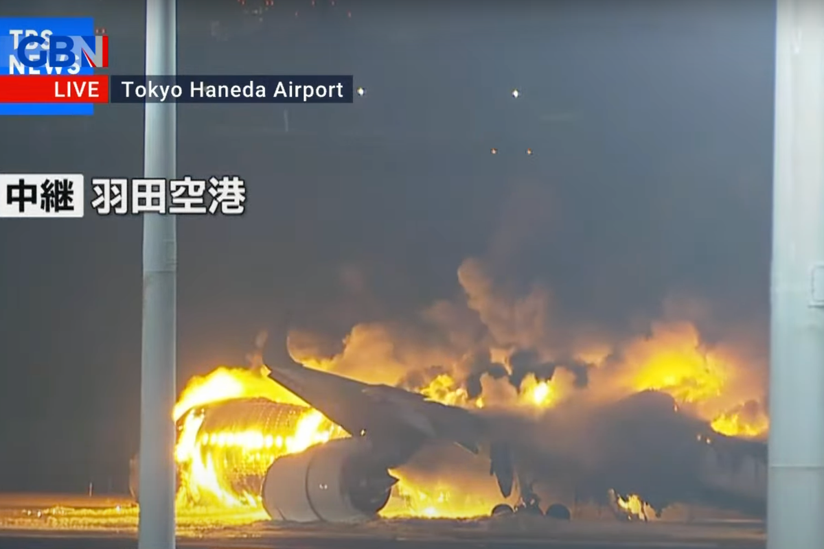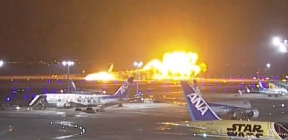 Footage on broadcaster NHK showed flames pouring out windows of the aircraft and underneath it.