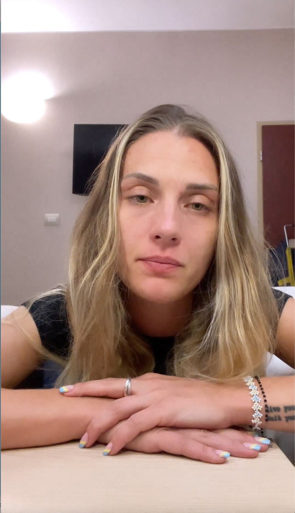Ukrainian fencer Olga Kharlan looks on during her video statement released July 27, 2023 in this screen grab obtained from a social media video.