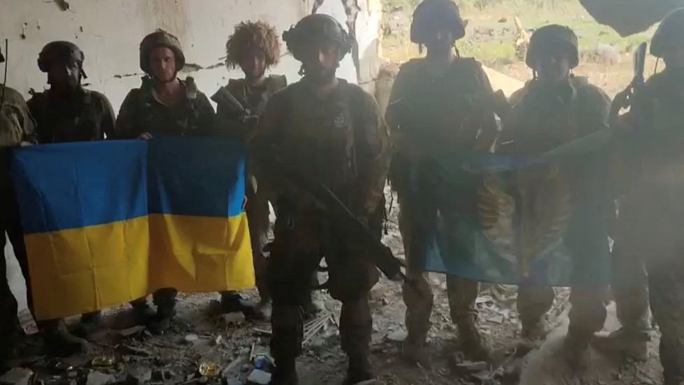 Ukrainian soldiers say they have recaptured the Ukrainian village of Staromaiorske, in Donetsk region, Ukraine, in this screen grab from video posted by Ukrainian President Volodymyr Zelenskiy and released on July 27, 2023.