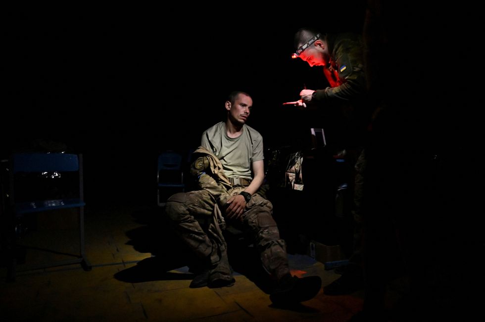A medic speaks with an injured Ukrainian serviceman inside a frontline medical stabilisation point, amid Russia's attack on Ukraine, in Ukraine July 27, 2023.
