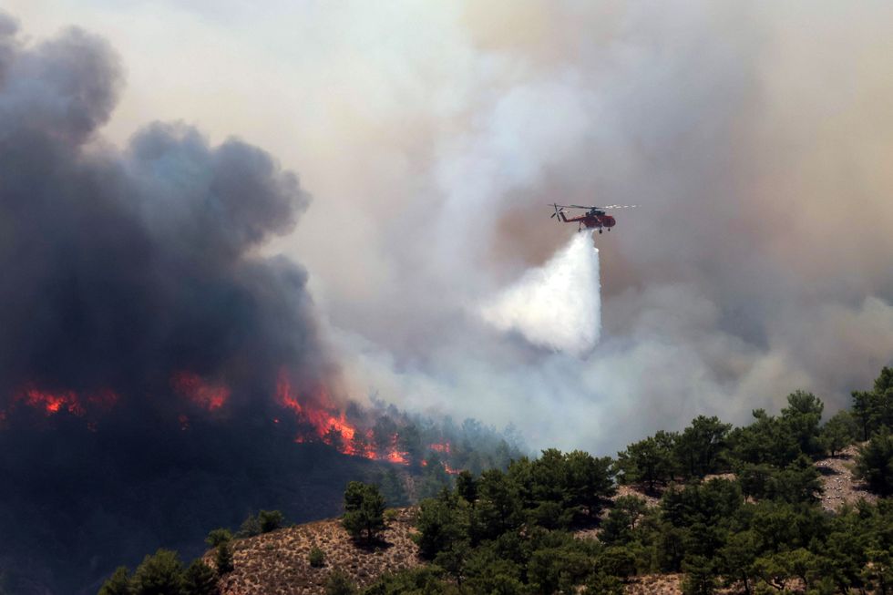 A firefighting helicopter makes a water drop as a wildfire burns near the village of Archangelos, on the island of Rhodes, Greece, July 24, 2023.