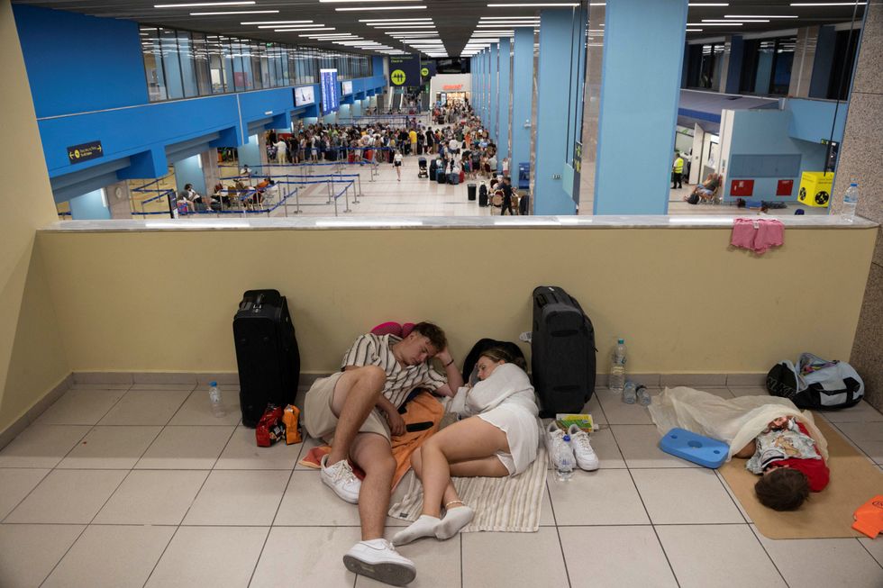 Tourists sleep as others line up at check-in counters, while waiting for departing planes at the airport, after being evacuated following a wildfire on the island of Rhodes, Greece, July 24, 2023.