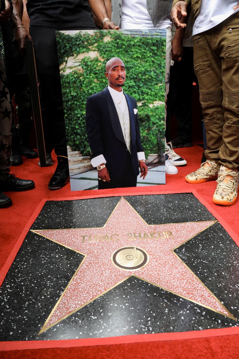 A person holds a picture of Rapper Tupac Shakur next to his star during its posthumous unveiling ceremony on the Hollywood Walk of Fame in Los Angeles, California, U.S. June 7, 2023.