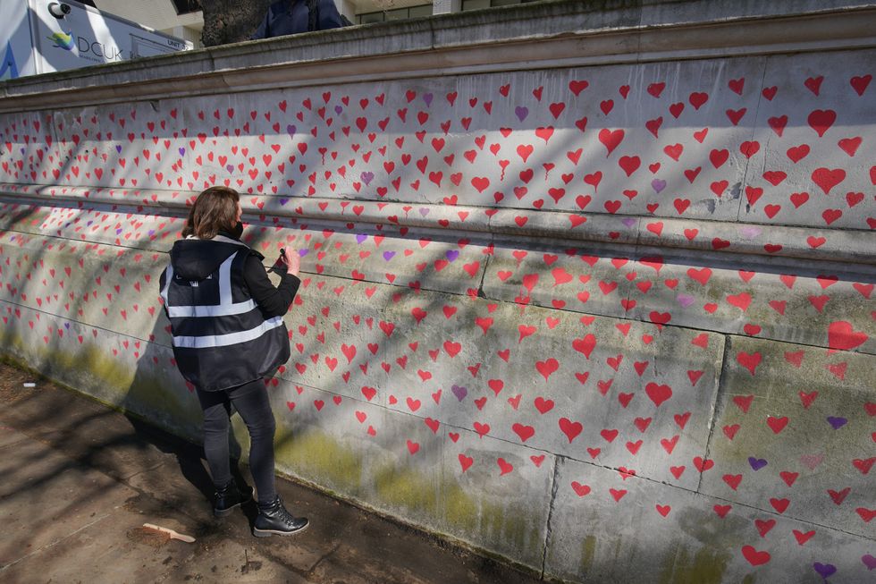A woman painting red hearts on the COVID-19 Memorial Wall