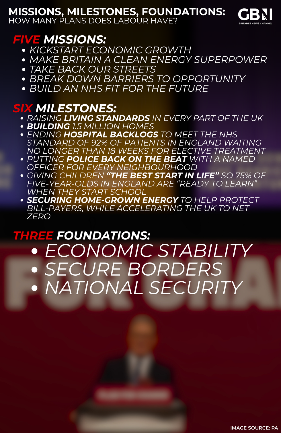 However, some months later, Starmer climbed on stage to outline six "ambitious milestones", alongside three "foundations" - taking the overall number of commitments made to the British public from just five to 14.