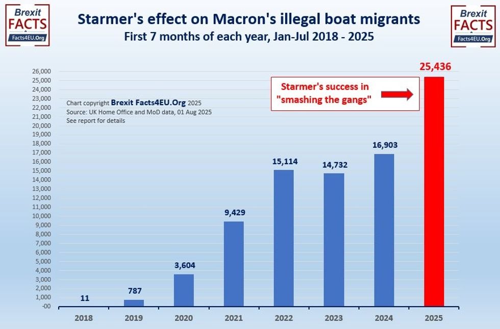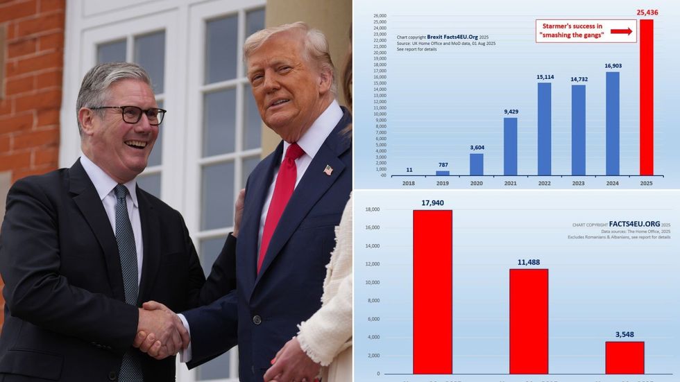 Despite the Labour leader's pledge to "smash the gangs", the analysis highlights that arrivals during the first seven months of 2025 exceeded the three-year average by nearly 10,000 individuals, according to Facts4EU.