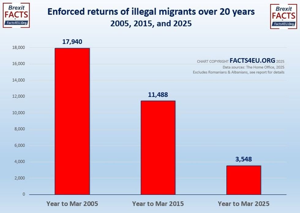 The data shows that in the first nine months since Starmer came to power (July 2024 to March 2025), there were 6,742 enforced returns of illegal migrants, as opposed to voluntary departures.