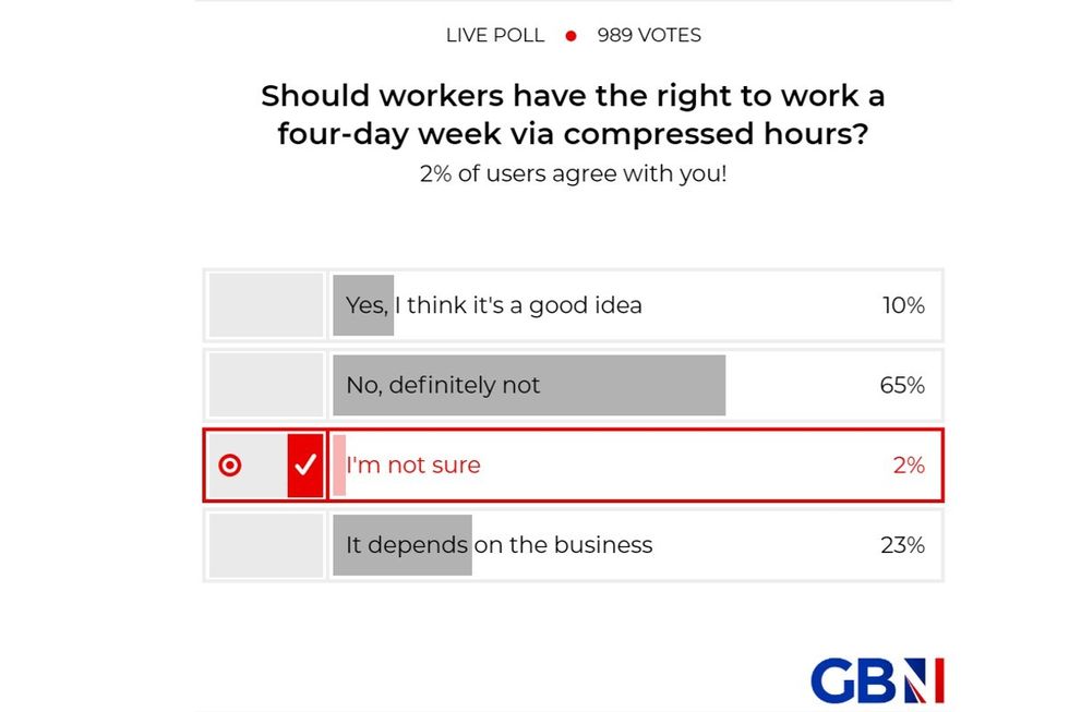 In the exclusive poll for GB News membership readers, an overwhelming majority (65 per cent) of the 989 voters thought workers should be given the right to work a four-day week, while just 10 per cent thought they shouldn't. A further 23 per cent said they thought it depended on the business and two per cent said they did not know.
