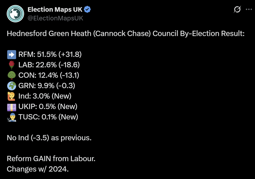 Comparing yesterday's result to the last time the ward went up to grabs just weeks before the 2024 General Election, Reform UK's support surged by 31.8 per cent to hit 51.5 per cent.