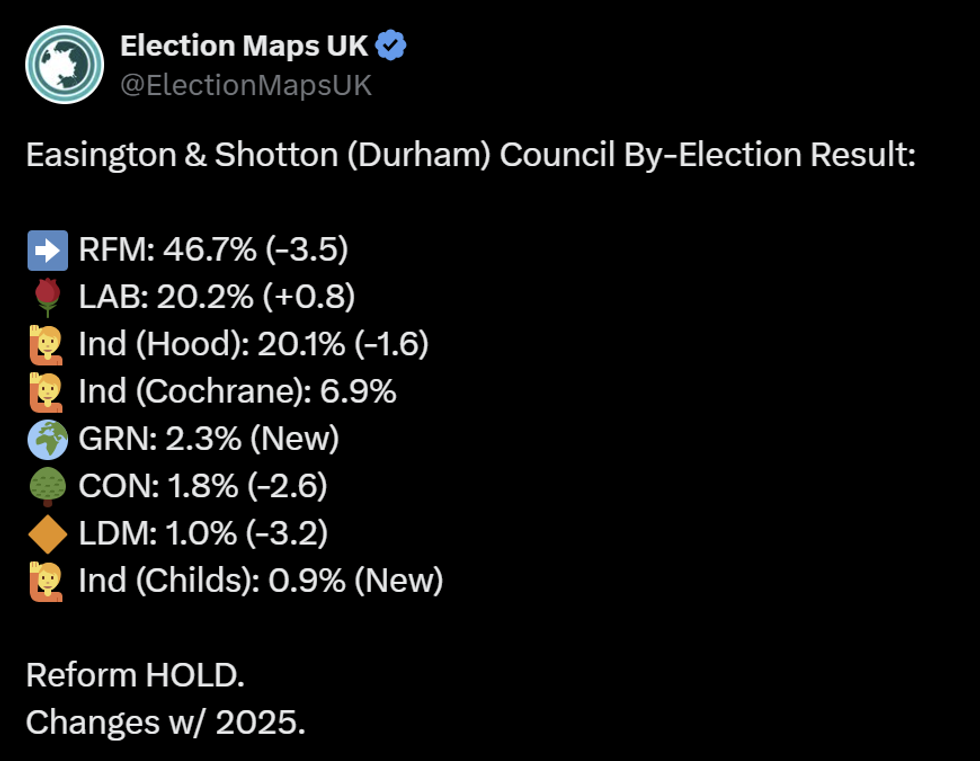 Despite registered net gains of 28 since the 2025 Local Elections, Reform was forced to wait for yesterday's result in Easington & Shotton to record its first successful defence.