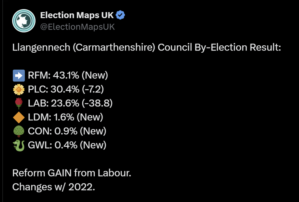 If the result in Llangennech is anything to go by, Reform is performing significantly better than it had in Llanelli last summer.