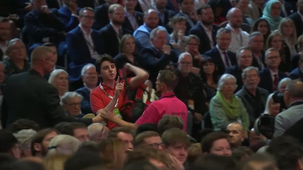 The young party member heckled the Prime Minister over Gaza before being escorted out by security.
