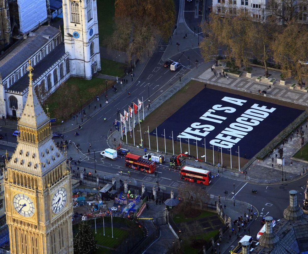 The 40x40-metre banner, laid out in Parliament Square, displayed the stark message: "Yes, its a genocide."