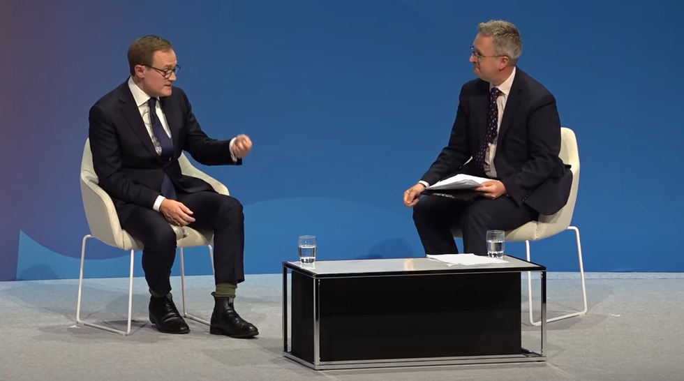 GB News' political editor Christopher Hope has started grilling Shadow Security Minister Tom Tugendhat as part of a series of interviews in front of thousands of Tory Party members in Birmingham.