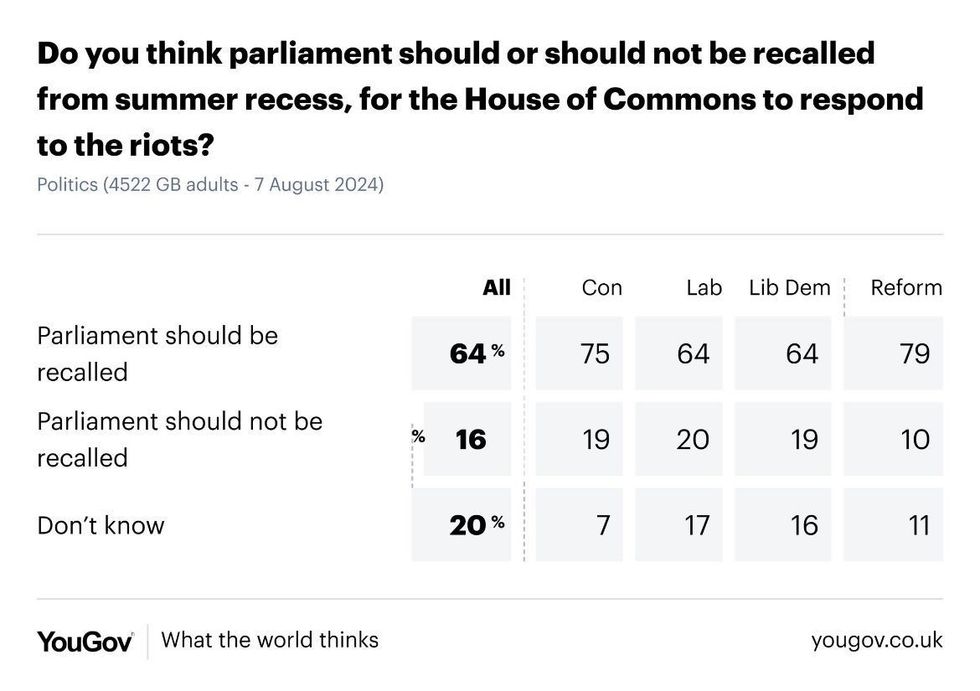 A new survey shows that 64 per cent of Britons think Parliament should be recalled to allow the House of Commons to respond to the riots.