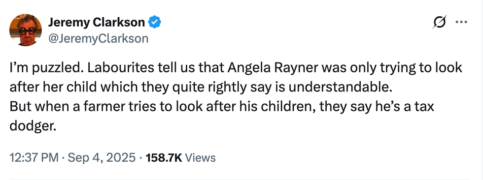 In his latest post to X, the former Top Gear host wrote: "I’m puzzled. Labourites tell us that Angela Rayner was only trying to look after her child which they quite rightly say is understandable.