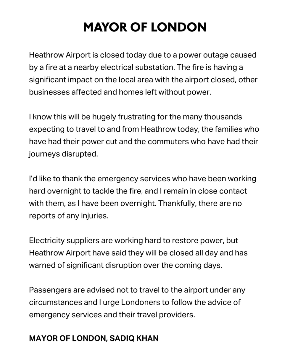 'Don't travel near there!' Sadiq Khan releases statement after Heathrow Airport chaos