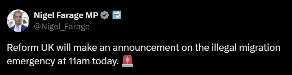 Taking to social media, the Clacton MP said: "Reform UK will make an announcement on the illegal migration emergency at 11am today."