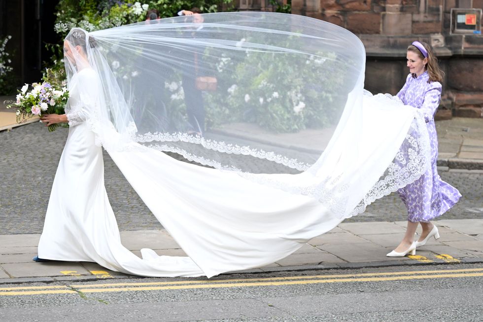 The Duke of Westminster’s bride-to-be looked stunning in a bespoke gown and veil as she arrived at Chester Cathedral.