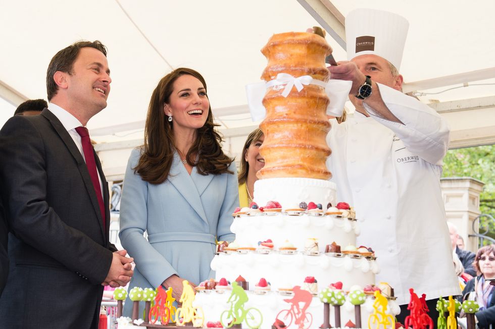 The Duchess of Cambridge and Xavier Bettel, Prime Minister of Luxembourg look at a cake with a cycling design while touring a cycling themed festival in Place de Clairefontaine Luxembourg.