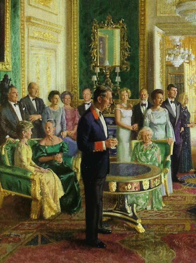 The painting captures a scene from Windsor Castle on 20 November 1997, when the Royal Family and esteemed guests celebrated the 50th wedding anniversary between Queen Elizabeth II and The Duke of Edinburgh.