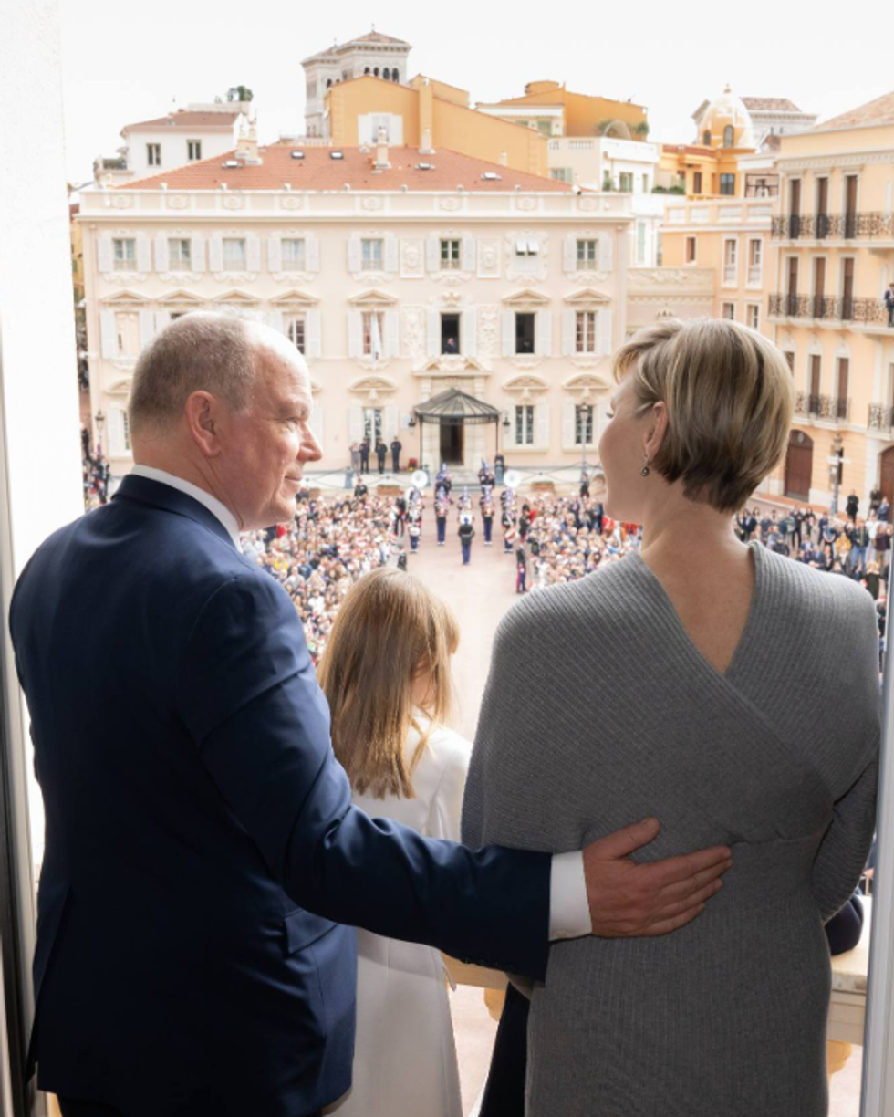 The Palace of Monaco’s Instagram account shared a sweet snap of the pair looking over the palace balcony, accompanied by their two children who are standing in front of them.