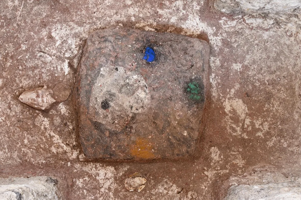 Blue azurite was used to mark the north, yellow ochre to mark the south, green malachite to mark the east, and pearly seashells the west.