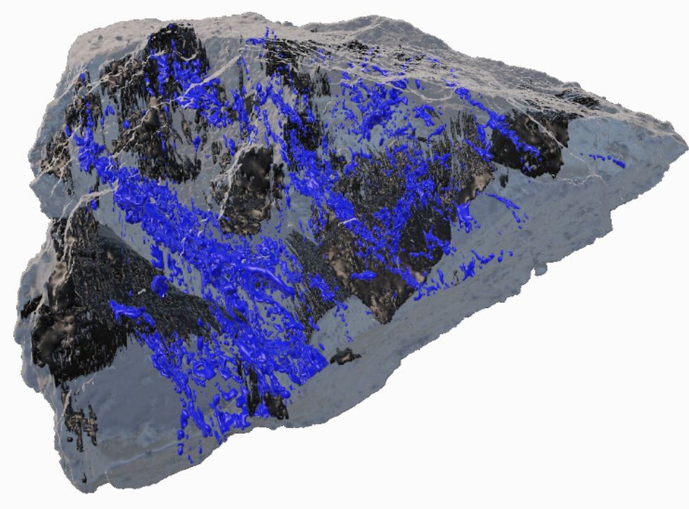 3D Model of the mm-sized sample of Ryugu showing fractures in black and veins in blue