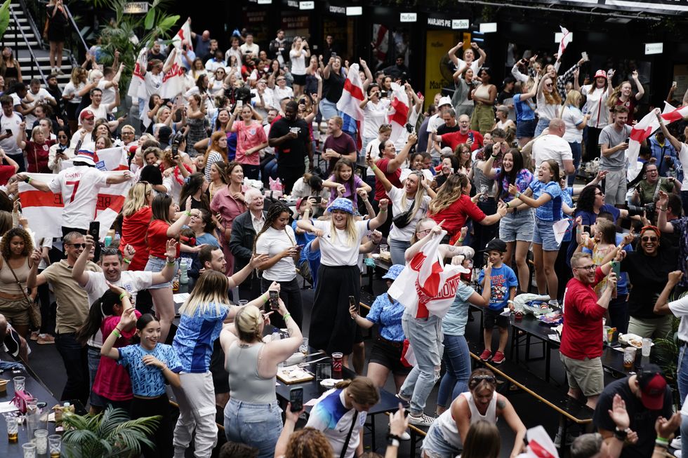 England fans celebrate their team winning during a screening of the FIFA Women's World Cup 2023 quarter-final match between England and Colombia at BOXPARK Croydon, London.