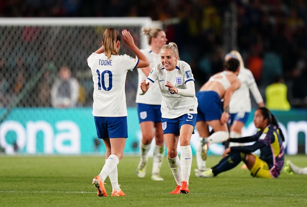 England's Alex Greenwood and Ella Toone celebrate victory after the FIFA Women's World Cup quarter-final at Stadium Australia, Sydney.
