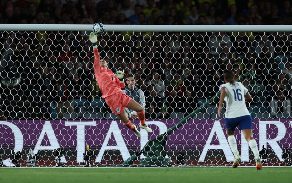 England goalkeeper Mary Earps makes a save during the FIFA Women's World Cup quarter-final at Stadium Australia, Sydney.