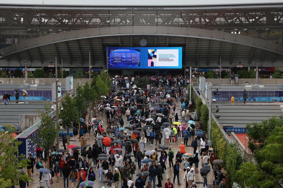 Heavy rain on the first day of the Paris Olympics has forced the men's skateboarding street competition to be postponed for two days while the weather also affected the tennis schedule.