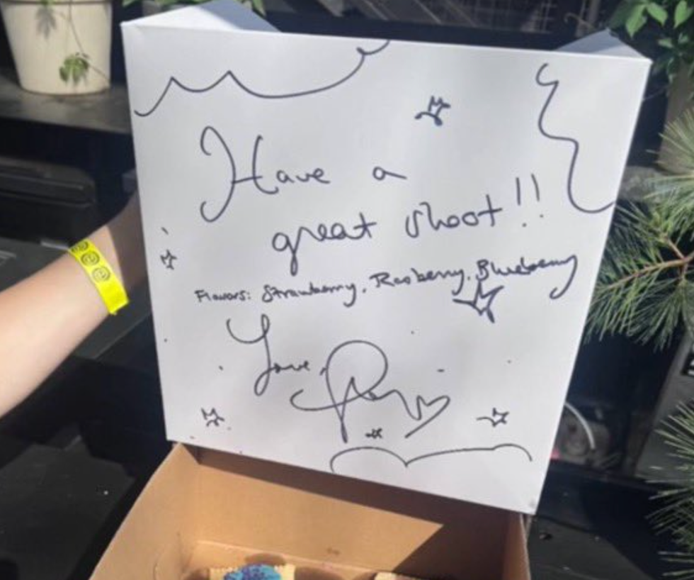 The thoughtful package included a handwritten note that read, "Have a great shoot!! Flavors: Strawberry, Raspberry, Blueberry." The note appeared to be signed by Swift and decorated with hand-drawn stars.