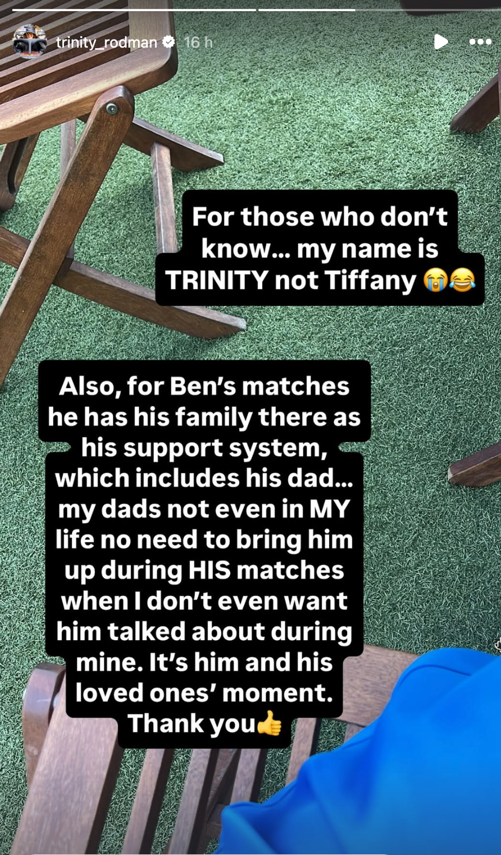 "For those who don't know... my name is TRINITY, not Tiffany," she wrote.