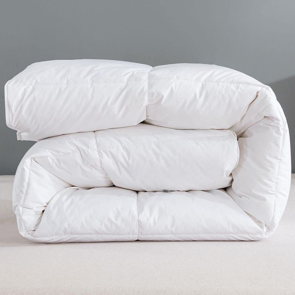 Filled with 50% goose down and 50% goose feather, this down duvet is lightweight, breathable, and hypoallergenic. The 100% cotton down-proof shell and box-stitched design prevent shifting, ensuring lasting softness, warmth, and a restful, temperature-regulated sleep all year round