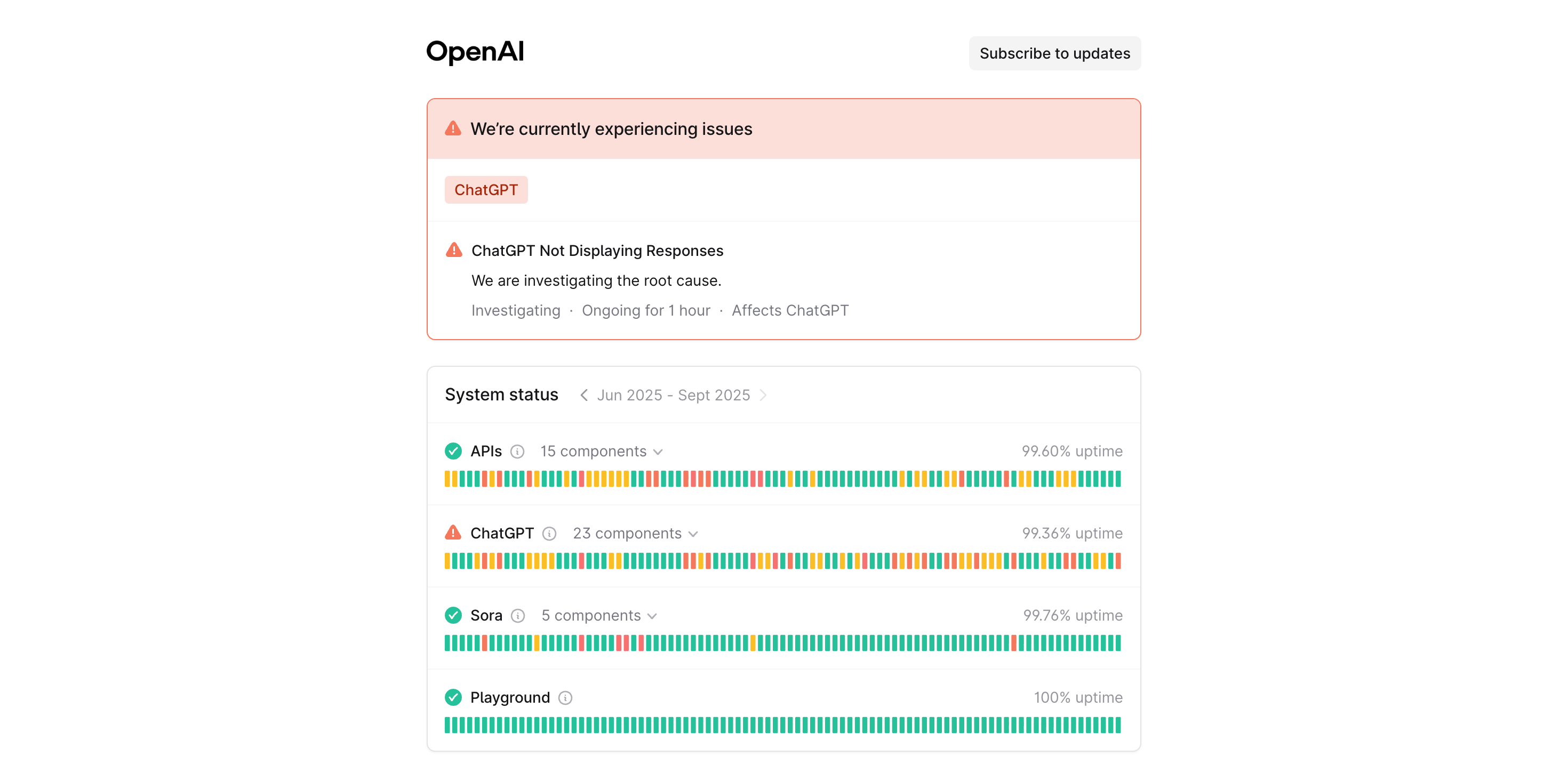 The ongoing outage is labelled as "ChatGPT Not Displaying Responses".