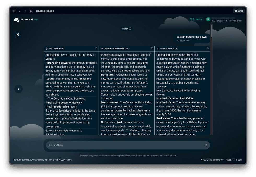ExpressAI offers a side-by-side comparison view, so you can run the same prompt across multiple models simultaneously and see how each of these tools offers a different perspective or reasoning style.