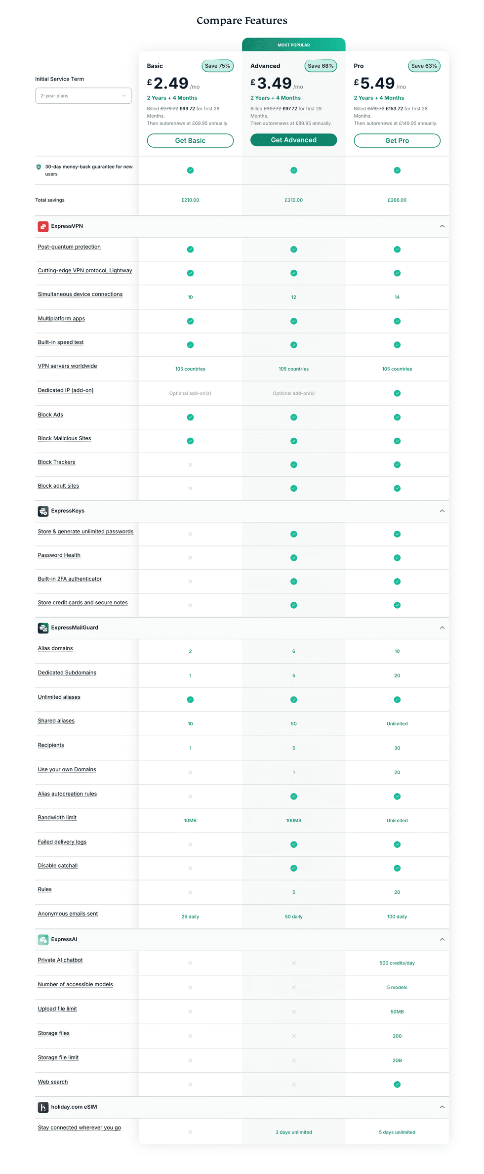ExpressVPN reserves certain features, like ExpressAI and ExpressKeys password manager, for its pricier packages, like Advanced and Pro plans