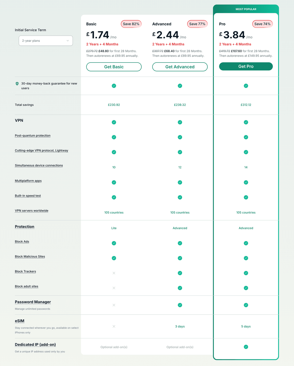 But ExpressVPN trumps NordVPN in terms of price when it comes to the premium plans. ExpressVPN offers its Pro plan for £3.84 per month, trumping the £5.19 per month that NordVPN charges for its Ultimate plan.