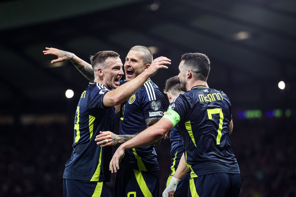 Scotland's Lyndon Dykes celebrates with Lewis Ferguson and John McGinn as he scores to make it 3-1 during a 2026 FIFA World Cup Qualifying match between Scotland and Greece at Hampden Park, on October 09, 2025