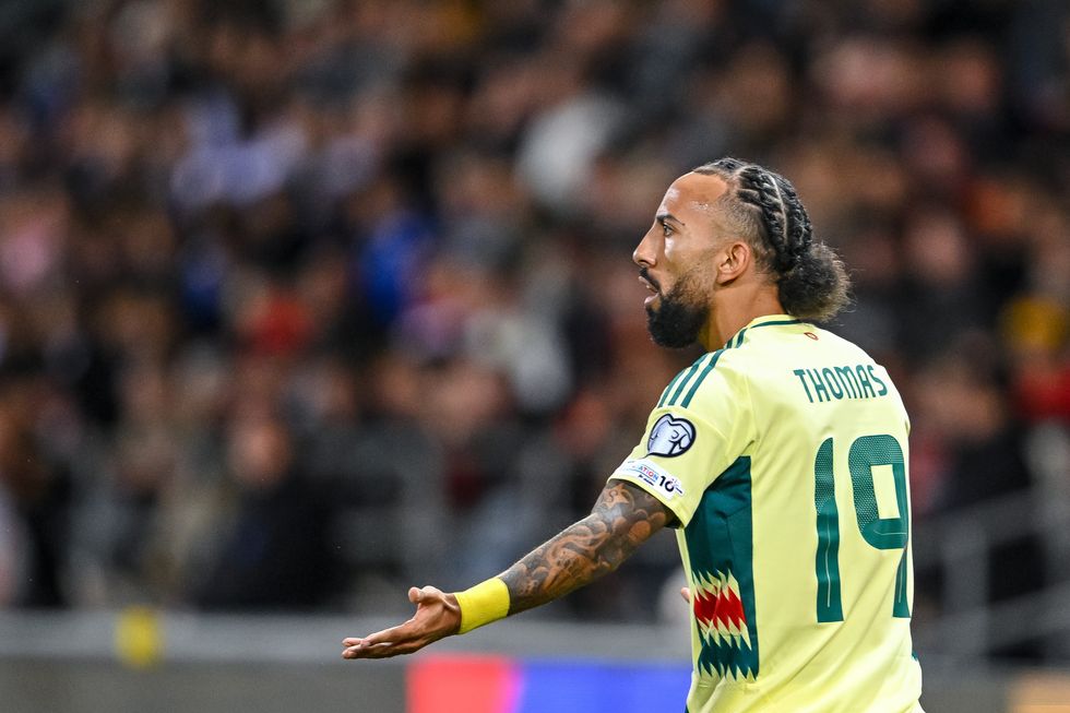 Sorba Thomas of Wales gestures during the FIFA World Cup 2026 qualifier match between Liechtenstein and Wales at Rheinpark Stadion on November 15