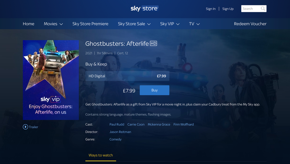 Ghostbusters: Afterlife currently costs £7.99 to buy and own from the Sky Store, but if you're a Sky VIP users then you're able to download and keep the blockbuster film for free