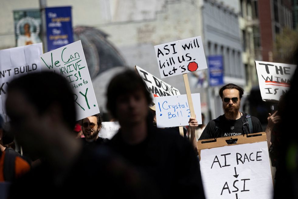A protester holds up a placard that reads "ASI will kill us". This initialism refers to the idea of an Artificial Superintelligence that can outperforms humans in every cognitive field, including creativity, general wisdom, and social skills