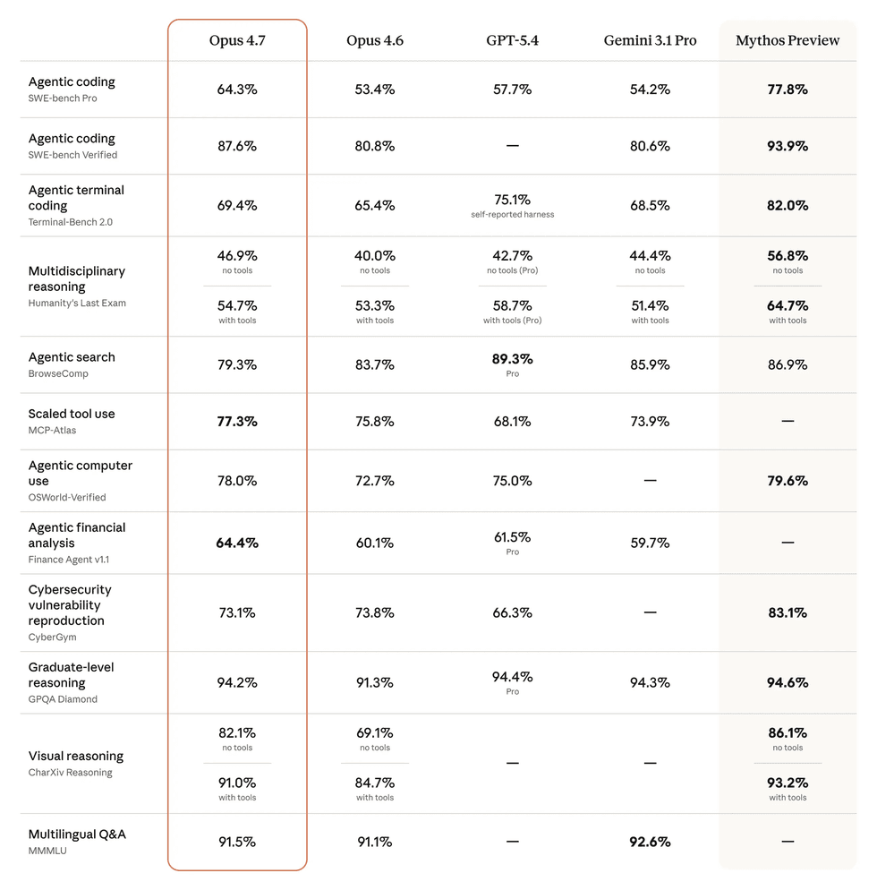 While Mythos is still under lock-and-key, the latest AI model from Anthropic's Claude agent – dubbed Claude Opus 4.7 – started to roll-out earlier this week. In a chart shared on its blog, Anthropic compared its capabilities against other publicly-available models ...and its own Mythos