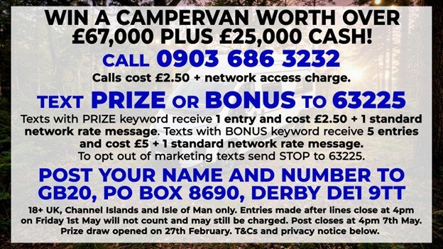 The Prize Draw commences for entries via SMS, phone, online and post at 4pm on 27th February 2026. Entries via SMS, phone and online close at 4pm on Friday 1st May 2026 (Paid Closing Date), while entries via post must be received by 4pm on Thursday 7th May 2026 (Postal Closing Date). Any entries received after the relevant closing date will not be included within the Prize Draw but may still be charged to the mobile phone bill. Accordingly please DO NOT try to enter after the Paid Closing Date. If viewing on-demand services, please check entry dates are still valid.