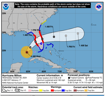 The National Hurricane Center (NHC) predicts that Hurricane Milton will make landfall in Florida on Wednesday night, local time, as an "extremely dangerous hurricane."
