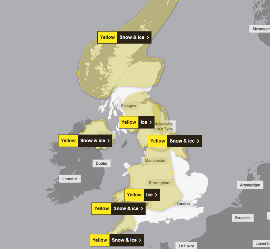 Elsewhere in the country, yellow weather alerts for snow and ice are due to hit Northern Ireland and most of Scotland in the coming days.