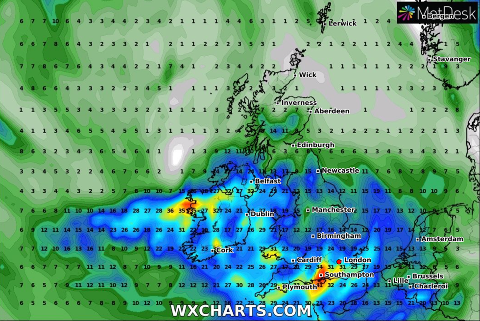 “This deep low-pressure system will also bring heavy rain to much of the UK, but the heaviest rain is expected in southern and western areas with 20 to 25mm quite widely across the region but up to 40 to 60mm potentially over higher ground.